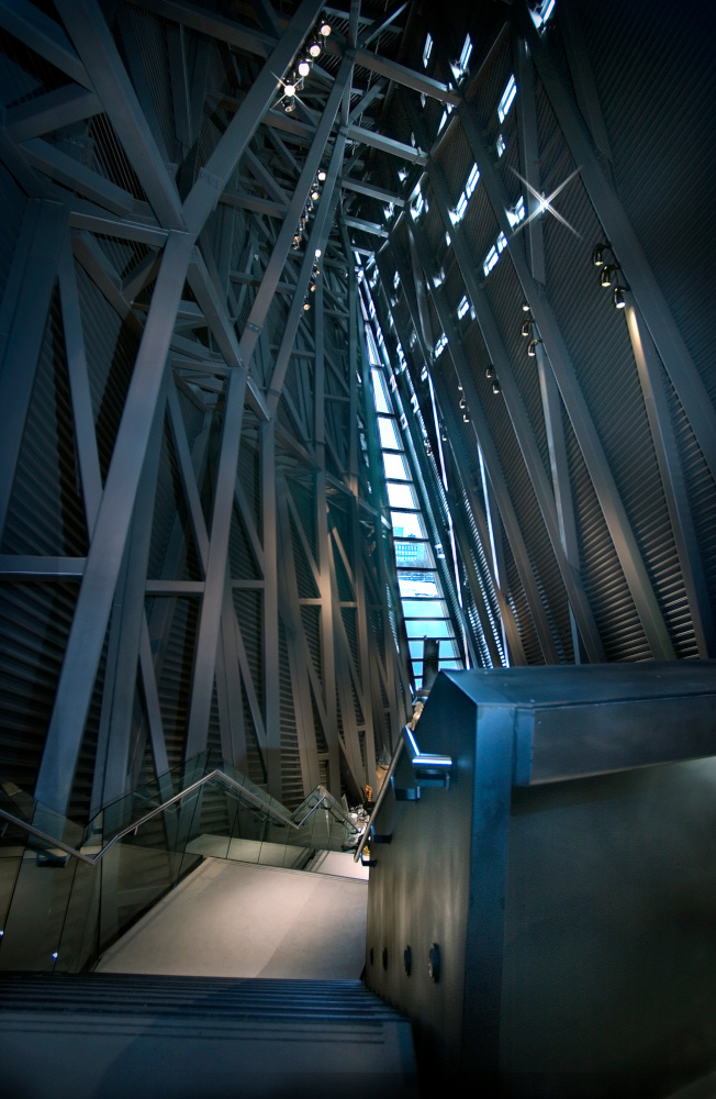 Cette tension s’applique également à la façade extérieure. Le Musée a été le premier bâtiment construit sur un terrain industriel, gazonné et abandonné depuis longtemps. L’idée que la croissance et le renouveau demeurent possibles après la destruction et la perte a joué un rôle important dans la conception du bâtiment.