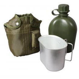 L’ensemble comprend une gourde en plastique, une tasse en aluminium et un étuit de transport de couleur vert militaire. Idéal pour le camping et les activités extérieures.