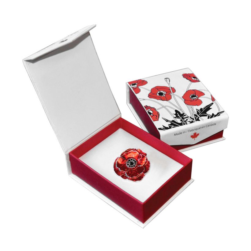 L’équipe de conception de la Légion, dirigée par l’artiste Karen Taylor, est partie de l’idée de produire un bijou dont le thème est le Souvenir tout en étant magnifique. Le résultat est cette broche Coquelicot élégante. On retrouve au centre de la broche des pierres noires incrustées, nichées parmi des pétales émaillées d’un rouge foncé sur de l’étain plaqué argent, le tout retenu à votre vêtement par une broche traditionnelle.