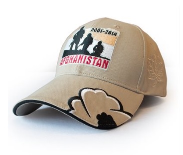 L’Afghanistan,la plus longue guerre du Canada. Plus de 40 000 soldats ont répondu à l’appelet servi : 2179 ont été blessés et 158 ont fait le sacrifice ultime. Des milliers d’autres auront besoin de notre aide dans les années à venir. Sur le devant de la casquette, on retrouve les silhouettes de soldats, et 2001-2014, indiquant les années de service des Canadiens.