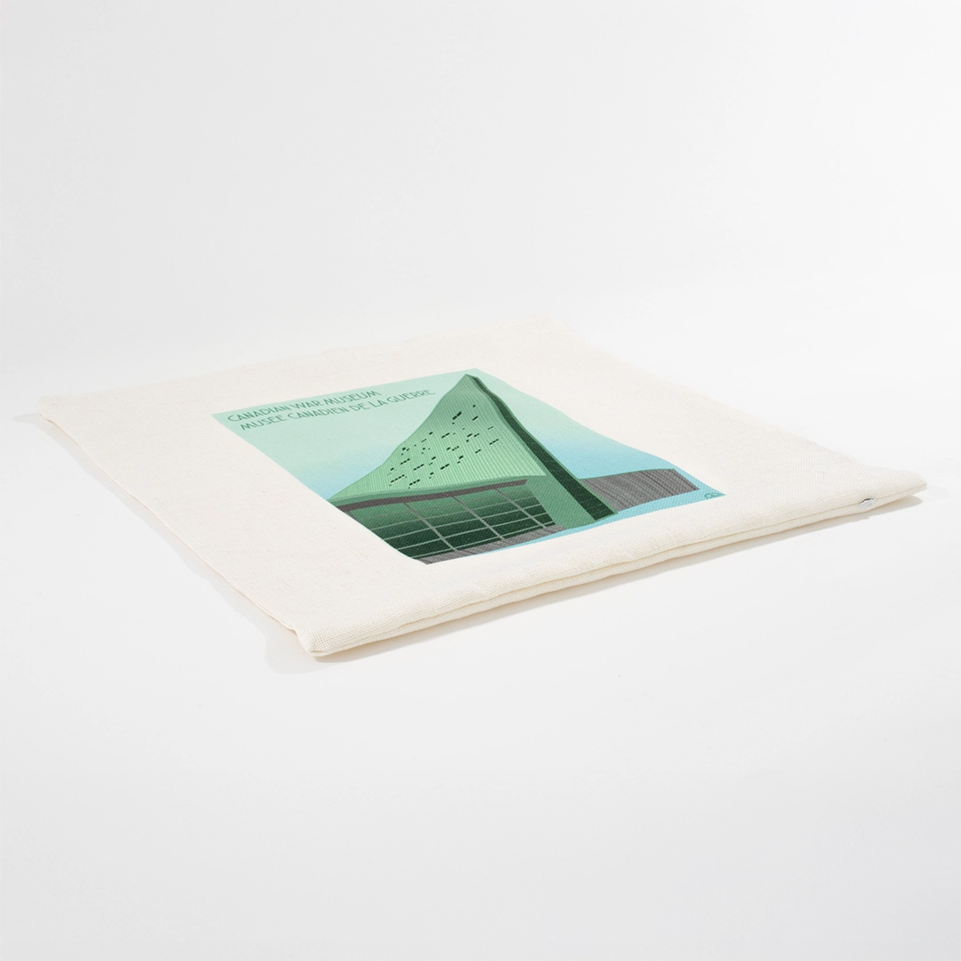 Ce couvre-oreiller, qui fait partie de la collection du Musée canadien de la guerre, met en valeur l’architecture angulaire frappante du musée, conçue pour créer un sentiment de déséquilibre. Cet effet de désorientation symbolise l’instabilité et le chaos de la guerre.