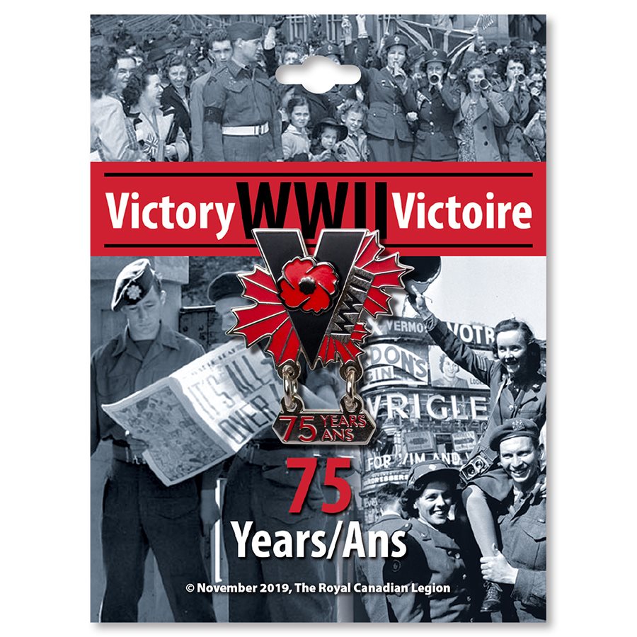 Avec le « V » pour victoire comme point central, cette épinglette célèbre le 75e anniversaire de la fin de la deuxième guerre mondiale. Le coquelicot est poinçonné à part et attaché au corps émaillé de l’épinglette. Cette épinglette est présentée sur un carton décoratif avec une petite description du produit.