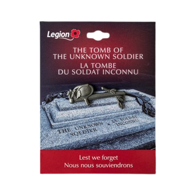 Alors que 2015 marquait le quinzième anniversaire de la mise en terre du Soldat inconnu au Monument commémoratif de guerre du Canada, La Légion royale canadienne a commandé cette épinglette commémorative de la Tombe du soldat inconnu pour montrer son appui à la commémoration de cette période historique du centenaire de l’histoire du Canada. L’épinglette est une version réduite de l’œuvre en bronze au sommet de la tombe, représentant une épée médiévale, un casque de la Première Guerre mondiale et des branches d’érable et de feuilles de laurier.