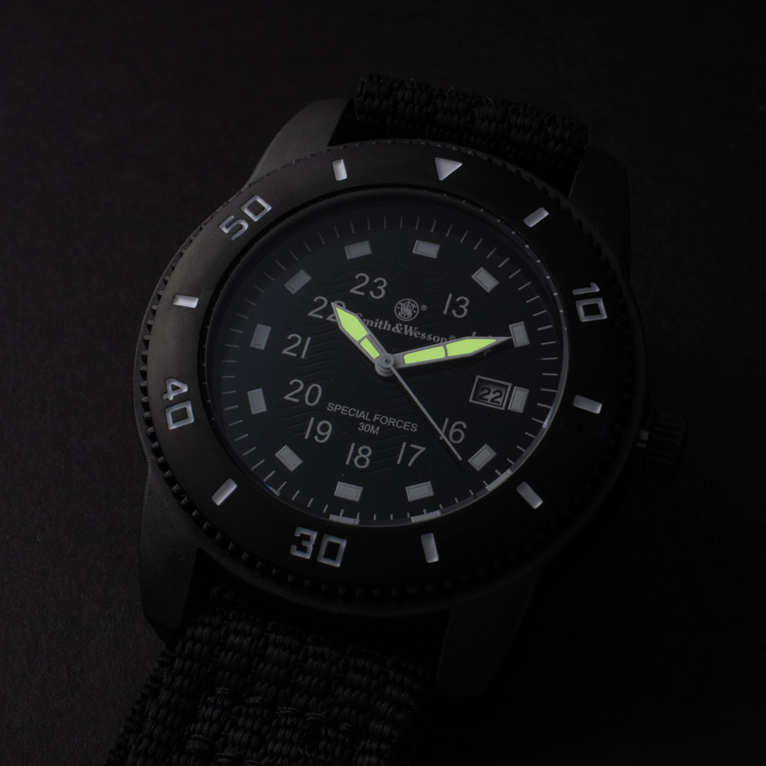 La montre Smith & Wesson Commando est résistante à l’eau jusqu’à 3 ATM/ 30 mètres / 99 pieds. Elle est équipée d’un quartz de précision et d’une lunette qui tourne dans le sens inverse des aiguilles d’une montre. Le bracelet réglable est en nylon pour un ajustement parfait.