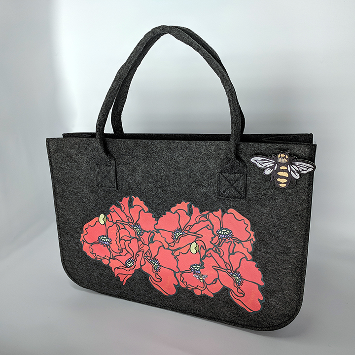 Fabriquée à la main avec un feutre de haute qualité, ce sac durable est décoré de coquelicots créés par Deborah Lyall. L’illustration de Lyall donne un ton élégant et moderne aux coquelicots.