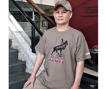 Ce T-shirt a été conçu de manière à incorporer le caribou avec accents aux couleurs rouge bordeaux et blanc en hommage au Royal Newfoundland Regiment. Fabriqué de 100 % coton prérétréci de 10 oz, il est offert dans les grandeurs de Petit à 3XG. On retrouve sur la manche gauche du T-shirt le logo imprimé de la Légion.